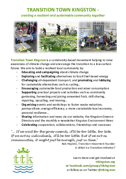 For what’s on currently, see also: Events section, TTK updates and discussions on our Facebook page, and the monthly Kingston Environment News.